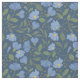 Ce tissu à motifs floraux présente des illustrations de fleurs bleues à perwinkle avec des feuilles verts dressés contre un arrière - plan bleu marine.