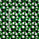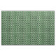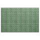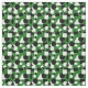 Ce tissu a une conception Bauhaus de triangles, cercles, rectangles et pentagons en noir et blanc sur un champ de vert.