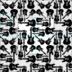 Un design de tissu à thème musical noir et blanc avec des illustrations en silhouette de guitare électrique noire sur un arrière - plan blanc.