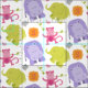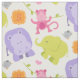 La conception de tissu à motifs personnalisés comprend un monogramme initial et motif de bébés amis animaux de la jungle - un oiseau, un singe, un éléphant et un hippo. Ce tissu safari moderne et sucré présente des couleurs vives, rose, orange, vert citron, violet et gris.