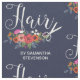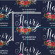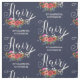 Motif floral pour un coiffeur, un coiffeur ou un barbier bleu marine avec les cheveux écrits dans un script charmant, une paire blanche de ciseaux, votre nom, et un joli bouquet floral avec des fleurs en rose, orange, blanc et rouge corail.