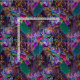 Ce design audacieux présente un magnifique paon turquoise et bleu avec des fleurs roses et violettes sur un arrière - plan violet aux ornements dorés.