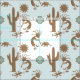 Motif du sud-ouest amusant avec Kokopelli jouant flûte, cactus, lézards et armadillo sous un soleil stylisé. Arrière - plan bleu Aqua. Le design fait partie de la collection Southwest Pastels. Les aperçus principaux ne reflètent pas la couleur réelle (la couleur semble s'estomper). Pour une vue plus précise de cette couleur de conception cliquez sur l'option finale, l'aperçu de tuiles.