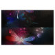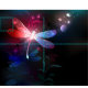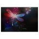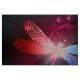 Libellule rouge, volante et lumineuse, avec des ailes transparentes et détaillées sur un fond sombre, nocturne et luminescent avec des plantes tropicales et des lucioles.