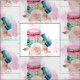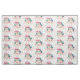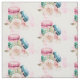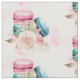 Tissu avec une image délicieuse. 3 macarons colorés, roses, verts et bleus avec un bouquet floral rose et une petite aquarelle rose derrière. Délicieux et élégant aussi ! Fond blanc.