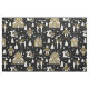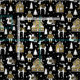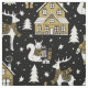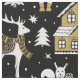 Ce mignon tissu de Noël présente un motif de cerfs blancs, noirs et dorés, des ours et des maisons sur un arrière - plan noir avec des étoiles et des pins. Utilisation pour des projets de vêtements de vacances ou d'artisanat. De nos coeurs aux vôtres, Joyeuses Fêtes !
