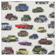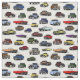 Tissu pour quiconque aime les vieilles voitures ; il présente un motif aléatoire d'illustrations d'automobiles vintages du XXe siècle.