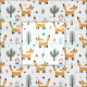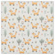 Un joyeux petit renard doré est la caractéristique de ce mignon tissu. En plus des images de renard sont des arbres et des fleurs de forêt. Tout est posé sur un arrière - plan blanc.