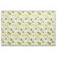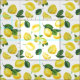 Tissu avec un mignon motif de citrons jaunes avec des feuilles verts et des tranches de citron fraîchement coupées.
