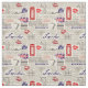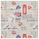 Un motif sans couture orienté de Londres a inspiré par des papiers de nouvelles. Le "texte" est réellement les points gris. Là l'arrière - plan est une couleur beige grise. Dans le motif il y a les cabines de téléphone rouges, le feuille bleu, les marques rouges de baiser, de "Londres" écrits dans la police bleue de manuscrit, le "thé" écrit dans la police grise de manuscrit, le feuille gris, les valises vintages grises de style et le croquis gris comme des tasses de thé avec la vapeur montant de elles. Il y a également d'Union Jack en couleurs.