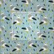 Ce tissu à motifs présente de jolies illustrations de style dessin animé de mouettes en blanc, gris, noir et orange avec des flecks de confetti coordonnés contre un arrière - plan bleu clair.