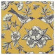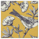 Ce tissu de coton peigné présente des oiseaux, des fleurs, des abeilles et des papillons en bleu marine et crème sur un arrière - plan jaune moutarde.