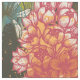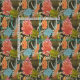 Un motif botanique africain abstrait dans les tons orange, rouge, bleu et vert sur un arrière - plan sombre.