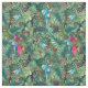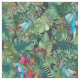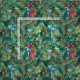 Oiseaux tropicaux parmi les feuilles plantes verts et feuillage entrelacé entouré de fleurs avec un arrière - plan couché de soleil