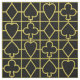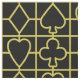 Ce tissu de métier inspiré par tisonnier a un motif sans couture fait de costumes de paquet de cartes de jeu. Pelles, trèfles, coeurs et diamants adaptés ensemble dans le contour d'or sur un arrière - plan noir. Ce tissu semblera grand dans votre pièce de jeu si vous aimez n'importe quel type de jeu de carte, de tisonnier à l'euchre, au pont, au whist ou au nerf de boeuf. Il est également parfait pour un mariage orienté de Las Vegas.