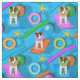 Ce tissu à thème amusant et coloré Jack Russell / Parson Russell comprend quatre terriers illustrés, chacun debout sur un tapis flottant dans une piscine cristalline avec une balle de tennis à ses pieds et portant une bague de natation colorée autour de son cou - les chiens ont des marques noires et marron variées de tête et de corps, et chacun incliné sa tête de façon capricieuse - les chiens sont entourés de différents jouets de piscine colorés, et vous pouvez voir les ombres le fond de la piscine - Jack Russell Terriers motif de la fête de la piscine © katz_d_zynes 2019 | vous aimerez peut-être une nouvelle version de ce motif où les chiens ne portent pas de bagues de natation | voir ici https://www.zazzle.com/another_parson_jack_russell_terrier_pool_party_fabric-256250386588949971