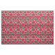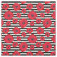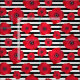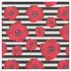 Un tissu floral comportant les pavots rouges dans différentes tailles contre les rayures noires et blanches.