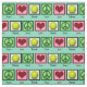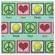 Tissu de tennis turquoise recouvert de signes de paix, coeurs et balles de tennis.