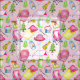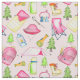 Ce tissu thématique camping est parfait pour les petites filles. Des illustrations d'aquarelle de tentes, de chaises de camp, de lanternes, de guimauves grillées et d'autres accessoires pour le joyeux camper sont dressées contre un arrière - plan rose pâle.