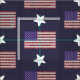 Puisse le drapeau flotter un jour avec ce motif de tissu patriotique. L'arrière - plan est bleu avec des étoiles blanches et des drapeaux américains de couleur vintage avec les mots de l'engagement d'allégeance écrit sur les bandes rouges.