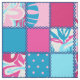 Hibiscus, oiseaux de paradis et beaucoup de points ne sont que quelques-uns des motifs de cette empreinte textile tropicale patchwork. Il y a d'autres objets de décoration dans le même design. Le motif est présenté en plusieurs couleurs.