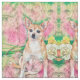 La mignonne Chihuahua est un tissu motif coloré pour elle. Portrait de chien beige arrière - plan vert rose et beige. Mélange d'épingles à broches mélangées à du matériel de couture d'artisanat. Beau, élégant, tendance, cool, chic, design en miroir. Copyright photo Marg Seregelyi Photography.