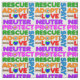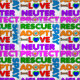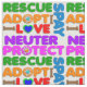 Libellé coloré de sauvetage animal, "spay, neuter, adopter, protéger, secourir et l'amour", avec des pattes et des graphiques en os de chien.