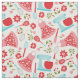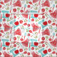 Motif à thème vintage avec tabliers, mixers, ustensiles de cuisine et fleurs dans les tons rose, rouge et bleu. Parfait pour les projets de cuisine chic et froids.
