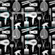 Tissu de coiffure dans un design rétro chic avec des outils de salon de coiffure en blanc avec de mignons petits coeurs contre un arrière - plan noir.