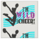Le tissu Cheerleading qui a un mi-saut de pom-pom girl avec le pont de pom à disposition et le texte, "je suis sauvage au sujet de l'acclamation !". Le mot "sauvage" a un motif d'impression de guépard là-dessus.
