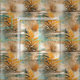 Un design artistique sans faille de vagues dorées scintillant dans le blues, le turquoise et la mousse blanche qui s'écrase contre le rivage, peint à l'huile, est associé à une belle aquarelle de plantes aquatiques d'inspiration japonaise en orange et marron, se reflétant dans l'eau.