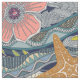 Fleurs d'hibiscus tropical, motif d'étoiles de mer et de vagues, dessinées à l'origine à l'encre. Disponible en terre, fer, mûre et marine.