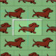 Tissu courant de vert de mousse de teckel lisse rouge. Un chiot d'une chevelure lisse rouge adorable de teckel fonctionne avec des yeux de scintillement. Art gai et fantaisie et drôle de chien créé par Naomi Ochiai du Japon. Conception mignonne de bande dessinée de teckel pour les amoureux de les chiens qui aiment Doxie ! !