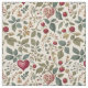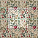 The image shows a delightful pattern on a fabric or wallpaper. The pattern features a mix of botanical elements and small hearts scattered across a light beige background. Various types of berries, leaves, and flowers in different colors, including purple, red, and blue, make up the design. Small hearts in red, pink, and purple are interspersed among the botanical elements, creating a delicate and whimsical look reminiscent of nature.