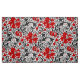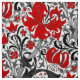 Tissu d'une vintage empreinte florale William Morris de lys stylisés et d'Irises, numériquement rehaussés et colorés, dans des tons gris/gris et noir de feuillage, avec des fleurs rouges profondes, sur un arrière - plan blanc