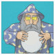 Old wizard with blue cape looking at crystal magic ball.