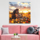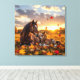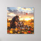 A pretty horse themed canvas art. A beautiful scene of a mama horse and her baby foal sitting on the Autumn leaves at dusk.
