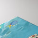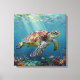 A sea turtle themed wall art with an illustration of a sea turtle under a calm teal sea swimming among the coral on the ocean floor with sun rays beaming down on him through the aqua water.