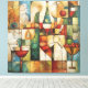 Bring warmth, rhythm, and modern sophistication to your space with this richly textured abstract still life. Composed in a cubist-inspired grid, the artwork blends wine glasses, fruit, and architectural forms into a harmonious mosaic of color and shape. Earthy ochres, deep reds, soft creams, and muted blues create a timeless palette that feels both contemporary and classic.