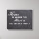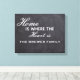 Impression de toile étirée personnalisée qui affiche le nom de famille écrit sur un arrière - plan texturé de tableau noir, ainsi que le texte "La maison est là où est le coeur". Cette impression de toile personnalisée fait un grand cadeau pour toute occasion.