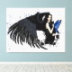 Un ange gothique tout en noir tient un chat noir avec des ailes de fées bleues. les deux sont dans un fond blanc avec de la peinture bleue. Fleurs tribales noires bordant le fond d'elles