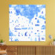Paysage moderne aquarelle représentant le village d'Oia sur l'île grecque ensoleillée de Santorin en bleu et blanc éclatant. J'aimerais être là tout de suite, en sirotant un verre de vin cool au soleil. Art original de Nic Squirrell.