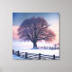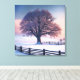 Arbre d'hiver et clôture dans un champ enneigé avec lever de soleil rose et ciel bleu