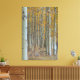 Une épandre dense de peupliers faux-trembles remplit le cadre, leur écorce blanche et lisse contraste fortement avec les feuilles jaunes vibrants qui s'accrochent encore aux branches. Les arbres sont hauts et tendres, créant un sentiment de profondeur et de perspective. Le sol est recouvert d'une couche de feuilles tombés et d'herbe sèche, ajoutant une touche de chaleur à la scène.
