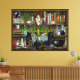 Un jeune sorcier mâle tenant un vieux livre avec un petit dragon vert mignon en haut du livre. Derrière, une bibliothèque remplie de livres, potions, chaudron, boule de cristal et plantes.