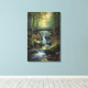 A serene forest scene featuring a rustic wooden bridge above cascading waterfalls, surrounded by mossy rocks and soft autumn foliage. The warm light filtering through the trees creates a peaceful, immersive atmosphere perfect for nature lovers and tranquil home décor. This high-quality artwork brings depth, calm, and elegance to any space.