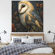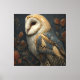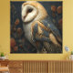 A magnificent barn owl with its signature heart-shaped face and piercing dark eye gazes intently amid scattered autumn leaves. Warm golden-brown plumage blends with creamy white and slate-gray accents, every feather rendered in exquisite detail against a rich, textured dark background. This realistic digital wildlife art captures quiet wisdom and seasonal elegance, making it ideal for canvas prints, posters, throw pillows, mugs, phone cases, and home décor that celebrates the beauty of owls and nature.