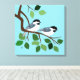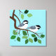 Deux poulets perchés sur une branche d'arbre entourés de congé sur un arrière - plan bleu clair