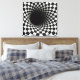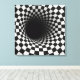 A tunnel-like optical illusion is created using a black and white checkered pattern, giving a dizzying sense of depth