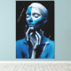 Ce dessin a été créé par #LeoPepeDesign, avec l'aide de l'intelligence artificielle. Il convient à une ligne de mobilier créative et audacieuse. La figure humaine dans cette image a la peau peinte en bleu et tient ses mains près du cou, créant une pose élégante et artistique. L'utilisation de la couleur bleue et la position des mains de la figure comme éléments distinctifs de l'image qui transmet une atmosphère artistique et intense.